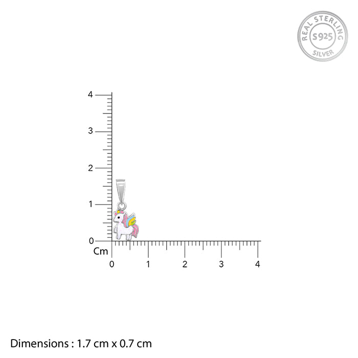 The Inspiration: Dear little dreamer, wear this silver unicorn with pride. And be a unicorn in a field of horses.🦄 The Design: This cute silver pendant has a unicorn motif with multicoloured enamel. 925 Silver Perfect for sensitive skin Length of chain: 43 cm + 4 cm Adjustable Motif Height: 1.7 cm, Width: 0.7 cm Comes with the Nikrish Jewellery kit and authenticity certificate Content: Pendant With Link Chain Net Qty- 1 unit Styling Tip: Wear this with a multicoloured dungaree dress.