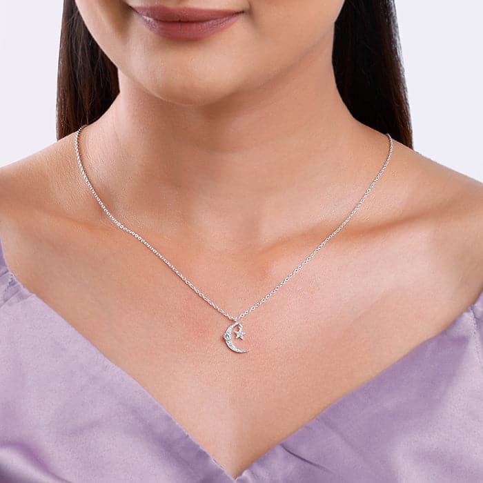 The Inspiration: Moon hanging out with her BFF star—just like your vibe. A pendant that says “I’m cosmic, chaotic, and cute. The Design: This silver pendant for women features a zircon-studded crescent moon with a sparkling star. The star dangles from the moon’s upper tip, adding extra shimmer. 925 Silver Perfect for sensitive skin Motif Height: 1.7 cm, Motif Width: 1.1 cm Length of Chain: 44 cm + 5 cm Adjustable Comes with the Nikrish Jewellery kit and authenticity certificate Content: Pendant with Link Chain Net Qty- 1 unit Styling Tip: Style this with a denim shirt.