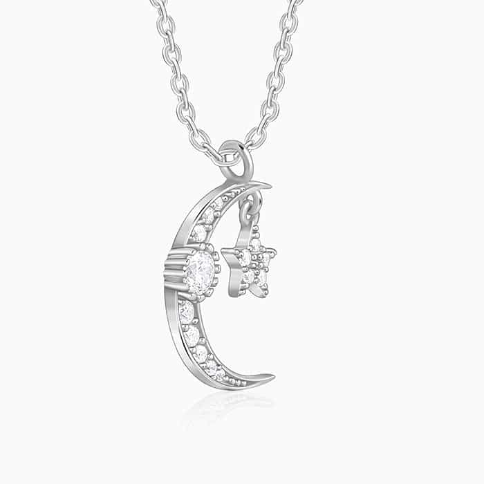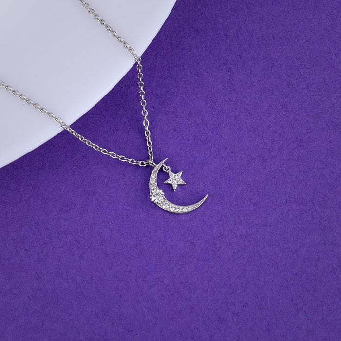 Silver Crescent Moon Star Pendant with Link Chain