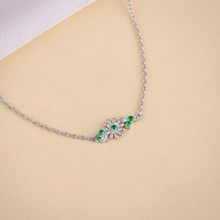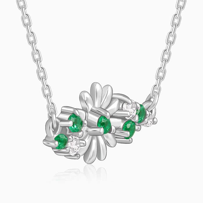 The Inspiration: Let your jewellery be a reminder. Even in chaos, you’ve always managed to sparkle. The Design: This silver necklace for women feature a flower design with green coloured stones at the centre. Zircons are delicately attached below for added sparkle. 925 Silver Perfect for sensitive skin Motif Height: 0.6 cm, Motif Width: 1.4 cm Length of Chain: 43.5 cm + 6 cm Adjustable Comes with the Nikrish Jewellery kit and authenticity certificate Content: Necklace Net Qty- 1 unit Styling Tip: Wear this with matching earrings.