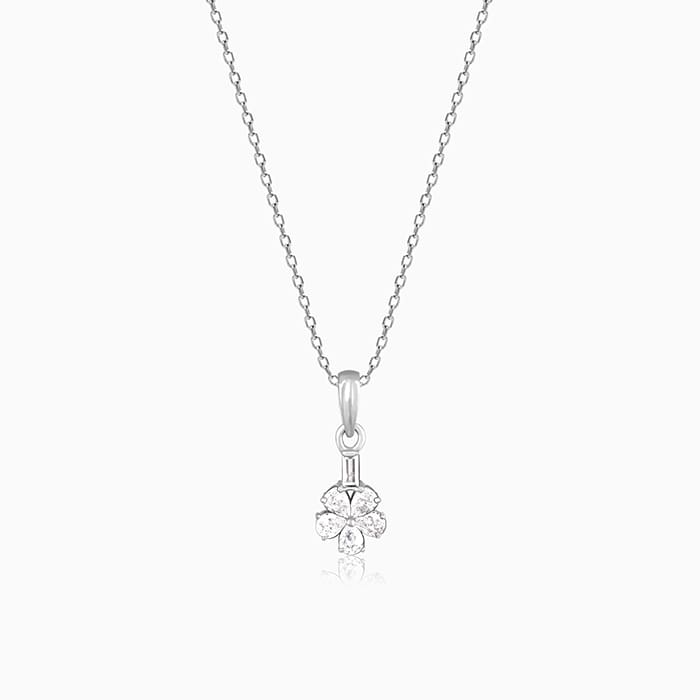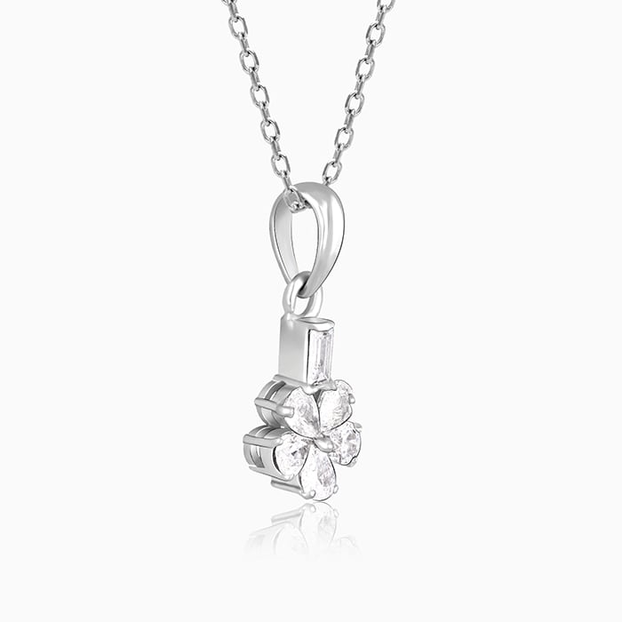 The Inspiration: The Silver Enchanted Floral Pendant With Link Chain is inspired by a captivating treasure that blossoms with elegance and charm. The Design: This silver pendant features five big zircons that make a beautiful flower motif set. 925 Silver Perfect for sensitive skin The chain size is 43 cm and the adjustable portion is 4 cm Motif Height: 2.2 cm, Width: 0.9 cm Comes with the Nikrish Jewellery kit and authenticity certificate Content: Pendant with chain Net Qty- 1 unit Styling Tip: Style this pendant with a tropical print scarf top and straight denim.