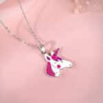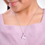 The Inspiration: A unicorn pendant for your little one’s big imagination. Let them carry a piece of magic wherever they go! The Design: This silver pendant for kids comes with a link chain, featuring a unicorn design with glossy enamel. 925 Silver Perfect for sensitive skin Motif Height: 2.4 cm, Motif Width: 1.7 cm Length of Chain: 35.5 cm + 5 cm Adjustable Comes with the Nikrish Jewellery kit and authenticity certificate Content: Pendant with Link Chain Net Qty- 1 unit Kids Friendly: Hypoallergenic (Skin-friendly) Comfortable to wear Cute designs Styling Tip: Style this (0-12 years) kids pendant with a unicorn bracelet.