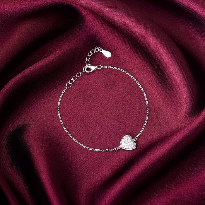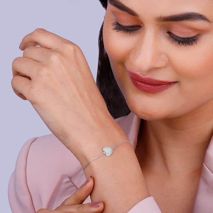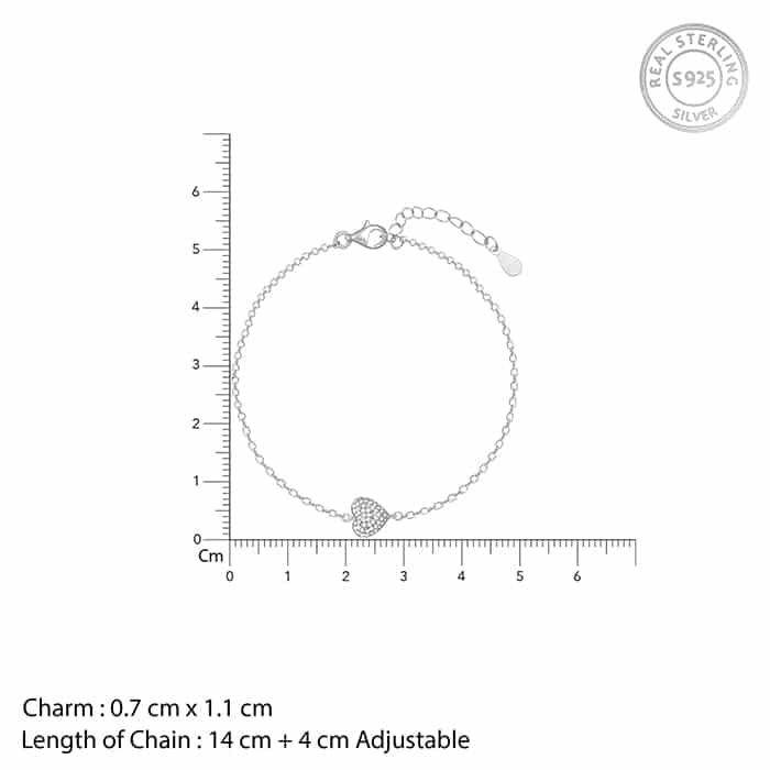The Inspiration: The Silver Filled with Love Bracelet takes inspiration from dazzling in love The Design: The silver bracelet features a dainty 3D heart studded with Zircon 925 Silver Hypoallergenic – Perfect for sensitive skin Charm Dimensions: 3.31 cm x 1.5 cm The length of the bracelet is 15 cm with a 5 cm adjustable portion Comes with the Nikrish Jewellery kit and authenticity certificate Net Qty- 1Â piece Styling Tip: Style this with a black crop top and mom denim jeans