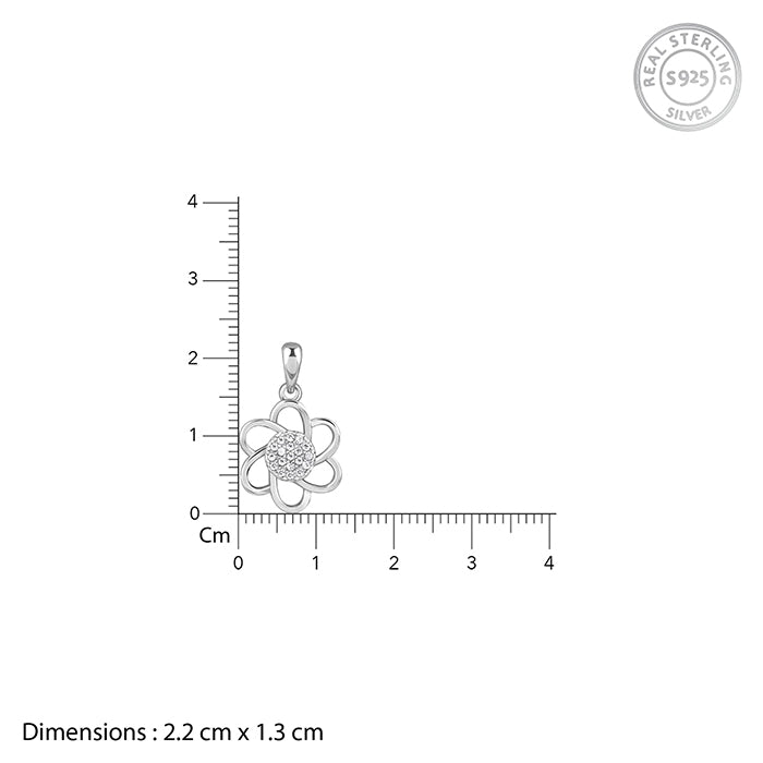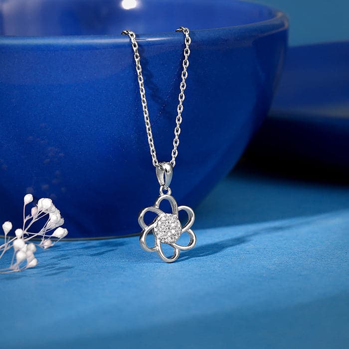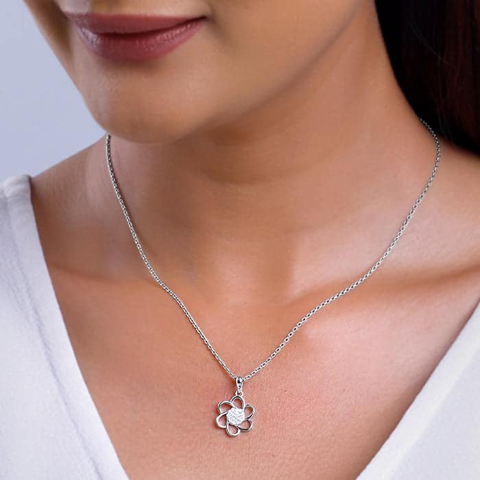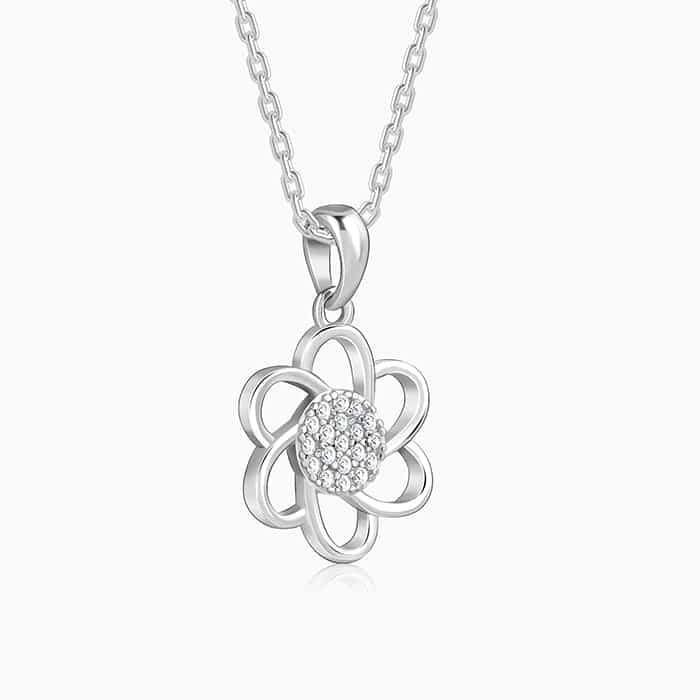 The Inspiration: Preserve your love with this silver floral pendant. A gift as beautiful as your feelings. The Design: This silver pendant with a link chain features a flower motif with zircons studded in the centre. 925 Silver Perfect for sensitive skin Motif Height: 2.2 cm, Motif Width: 1.3 cm Length of Chain: 43 cm + 4 cm Adjustable Comes with the Nikrish Jewellery kit and authenticity certificate Content: Pendant with Link Chain Net Qty- 1 unit Styling Tip: Style this with a baby pink dress.