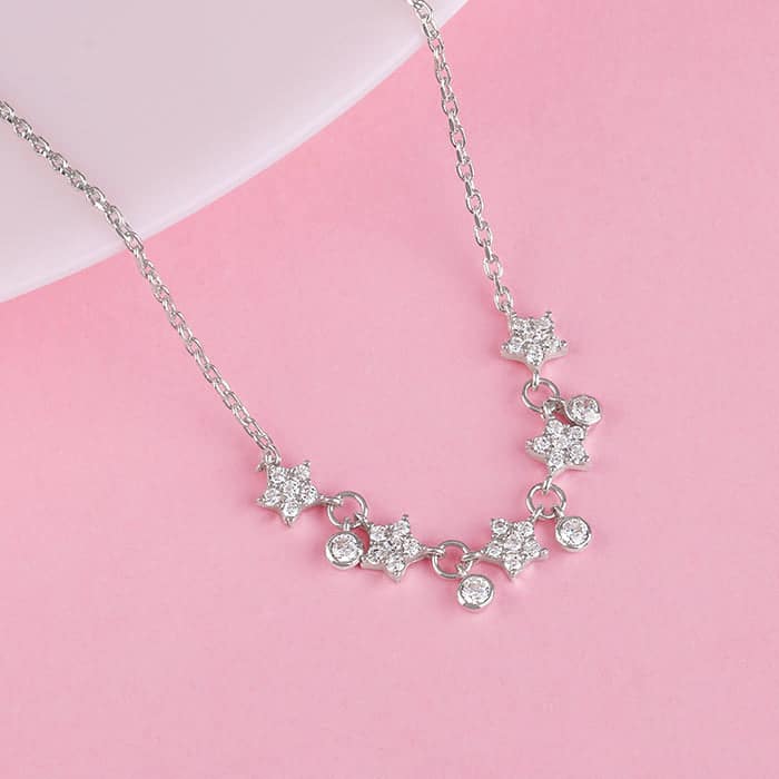 The Inspiration: This floral pendant’s got your mood covered – whether you’re feeling laid-back or all dressed up. It’s the kind of piece that looks good no matter what. The Design: This silver necklace for women has floral motifs. The design is alternatively set with circular charms, sporting zircons. 925 Silver Perfect for sensitive skin Motif Height: 0.6 cm, Motif Width: 4 cm Length of Chain: 44 cm + 6 cm Adjustable Comes with the Nikrish Jewellery kit and authenticity certificate Content: Necklace Net Qty- 1 unit Styling Tip: Style this with silver earrings.