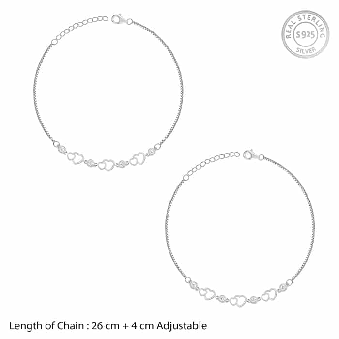 The Inspiration: Your ankle deserves a touch of elegance to shine with every step and make you the queen of the spotlight. The Design: This silver anklet features dual heart motifs interlocked with each other, alternated with circular motifs with zircons. 925 Silver Perfect for sensitive skin Length of the anklet: 26 cm + 4 cm Adjustable Comes with the Nikrish Jewellery kit and authenticity certificate Content: Anklet Net Qty- 1 unit Styling Tip: Pair this with your everyday outfit.