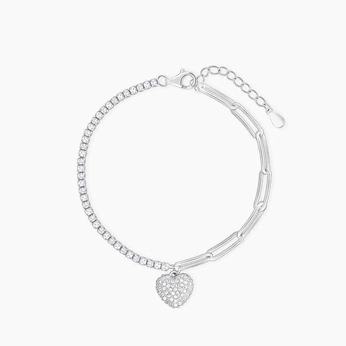 The Inspiration: Hearts, sparkle, and a whole lot of attitude—this bracelet’s got triple shine going on. Wear it and own the room, no filter needed. The Design: This silver bracelet for women features a modern half-and-half design—one side set with a line of zircons, the other with a bold paperclip chain. A zircon-studded heart motif at the centre creates a striking focal point. 925 Silver Perfect for sensitive skin Charm: 1.1 cm x 1 cm Length of Chain: 15.5 cm + 4 cm Adjustable Comes with the Nikrish Jewellery kit and authenticity certificate Content: Bracelet Net Qty- 1 unit Styling Tip: Pair this with a red chikankari kurta.