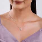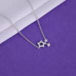 The Inspiration: Like silver stars frozen mid-fall, this neckpiece shimmers with an unspoken spell. Cast a quiet enchantment with every move you make! The Design: This silver necklace for women features two star motifs. The bigger one is hollowed out and is studded with zircons, while the smaller one is solid. A single round zircon dangles from the centre. 925 Silver Perfect for sensitive skin Motif Height: 1.3 cm, Motif Width: 1.4 cm Length of Chain: 43.5 cm + 4 cm Adjustable Comes with the Nikrish Jewellery kit and authenticity certificate Content: Necklace Net Qty- 1 unit Styling Tip: Wear this stylish necklace with any outfit.