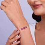 The Inspiration: This bracelet isn’t just an accessory, it’s an expression of your individuality and a symbol of refined beauty. The Design: This silver tennis bracelet features three flower motifs, each adorned with a pink-coloured stone, while the chain is studded with zircons. 925 Silver Perfect for sensitive skin Length of chain: 15 cm + 4 cm Adjustable Comes with the Nikrish Jewellery kit and authenticity certificate Content: Bracelet Net Qty- 1 unit Styling Tip: Style this bracelet with a yellow flowing skirt.