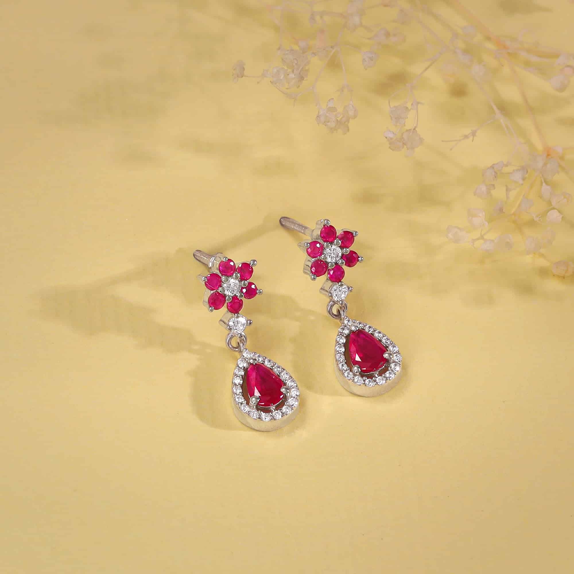 The Inspiration: Adore the floral warmth with these earrings. They are perfect for complementing your festive or party look. The Design: These silver earrings have a floral motif with a pear drop motif below, both studded with zircons and pink-coloured stones. 925 Silver Perfect for sensitive skin Earring Size: Height – 2.4 cm, Width – 0.8 cm Comes with the Nikrish Jewellery kit and authenticity certificate Content: Earrings Net Qty- 1 pair Styling Tip: Suit these with a pink sharara dress.