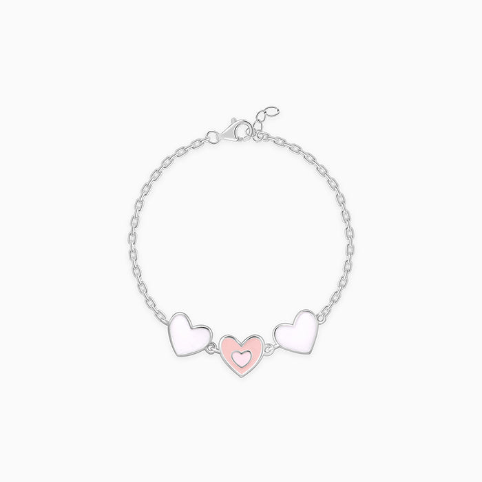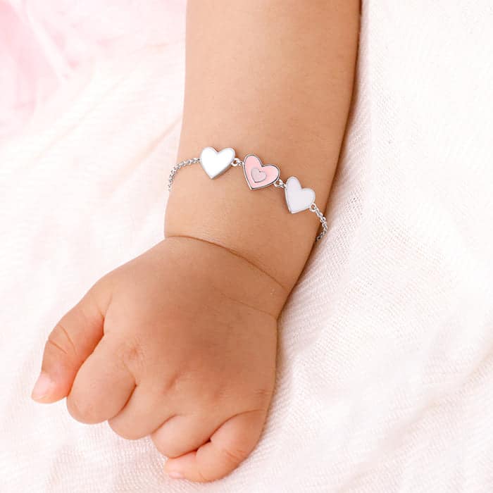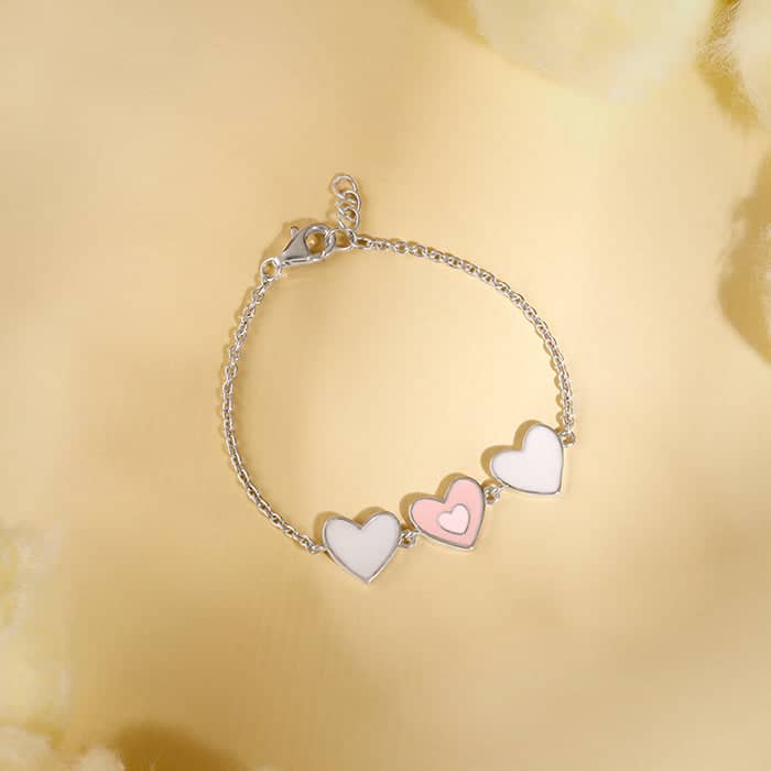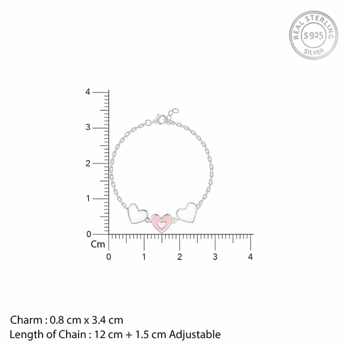 The Inspiration: Full of love, mischief, and magical pink twinkle, it’s made for your little one who shines from the inside out! đŸ’— The Design: This silver kids bracelet features triple heart motifs with colourful enamel. 925 Silver Perfect for kids’ sensitive skin Motif Size: Height – 0.8 cm, Motif Width – 3.4 cm Length of Chain: 12 cm + 1.5 cm Adjustable Comes with the Nikrish Jewellery kit and authenticity certificate Content: Bracelet Net Qty- 1 unit Suitable for kids aged 0 – 1 Years Styling Tip: Style this with heart-inspired studs.
