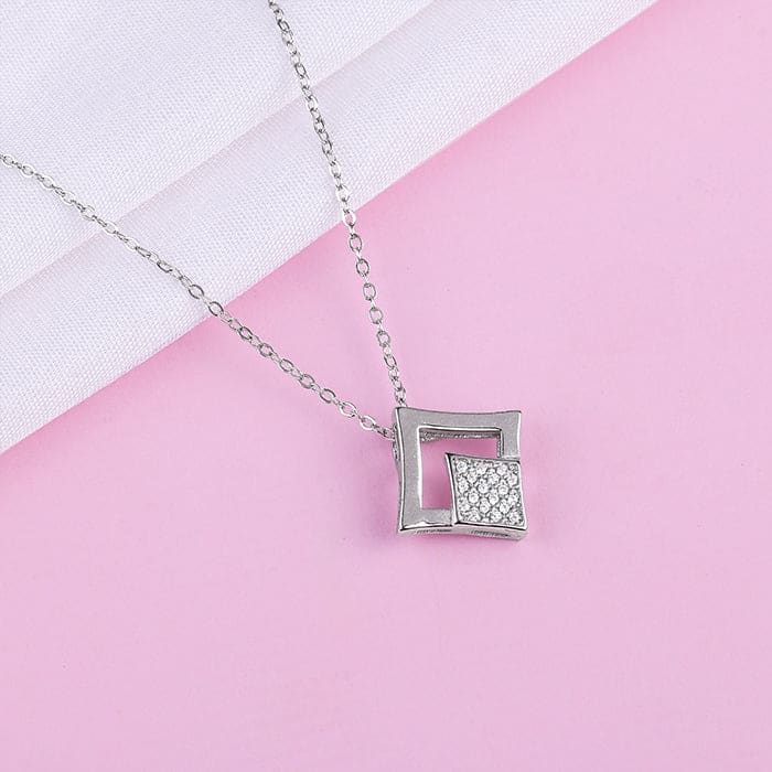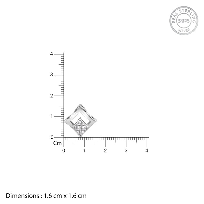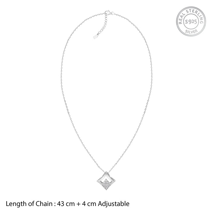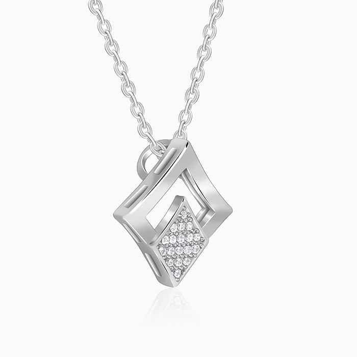 The Inspiration: A quirky twist on elegance, this radiant pendant is a perfect mix of bold design and sparkling glam. You’ll be the centre of attention wherever you go! The Design: This silver pendant for women features a small rhombus-shaped element set with zircons, attached to a larger semi-rhombus shape. 925 Silver Perfect for sensitive skin Motif Height: 1.6 cm, Motif Width: 1.6 cm Length of Chain: 43 cm + 4 cm Adjustable Comes with the Nikrish Jewellery kit and authenticity certificate Content: Pendant with Link Chain Net Qty- 1 unit Styling Tip: Style this with a multicoloured tank top and baggy pants.