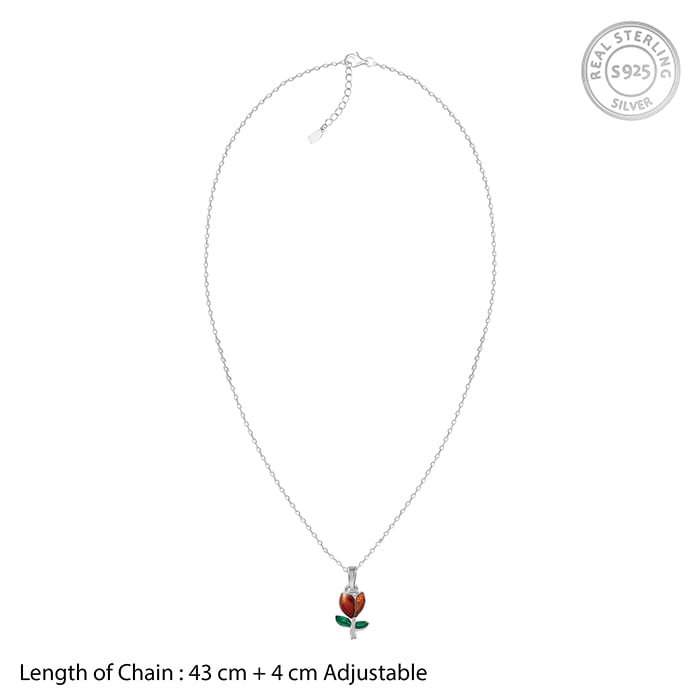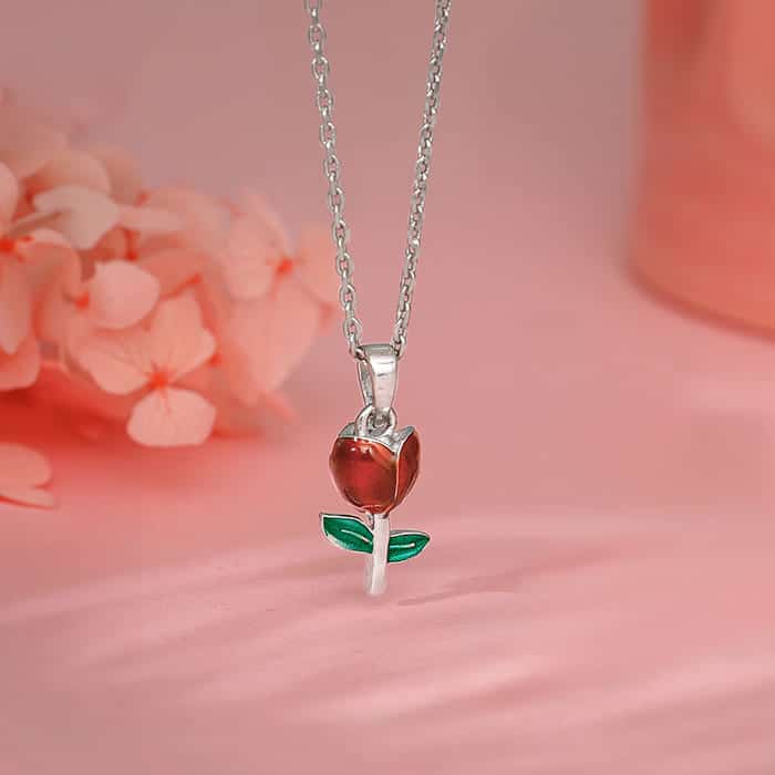 The Inspiration: A gift of love that will never wilt. This will always remind her of your affection. The Design: This silver pendant with a link chain features a rose motif coated with red and green enamel. 925 Silver Perfect for sensitive skin Motif Height: 1.8 cm, Motif Width: 0.8 cm Length of Chain: 43 cm + 4 cm Adjustable Comes with the Nikrish Jewellery kit and authenticity certificate Content: Pendant with Link Chain Net Qty- 1 unit Styling Tip: Pair this with a baby pink gown.