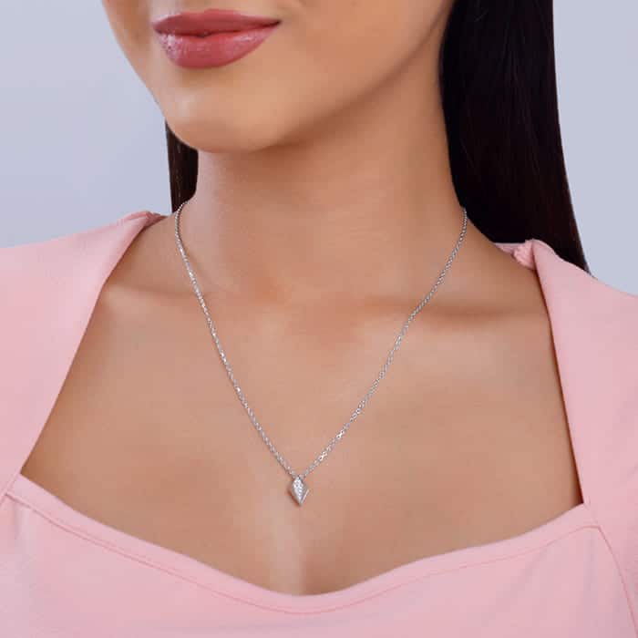 The Inspiration: Self-love is wearing earrings that make you feel like you can conquer the world. The Design: This silver pendant with a link chain for women features a rhombus design studded with zircons. 925 Silver Perfect for sensitive skin Motif Height: 1.2 cm, Motif Width: 0.7 cm Length of Chain: 44 cm + 5 cm Adjustable Comes with the Nikrish Jewellery kit and authenticity certificate Content: Pendant with Link Chain Net Qty- 1 unit Styling Tip: Style this silver pendant with shiny rhombus earrings.