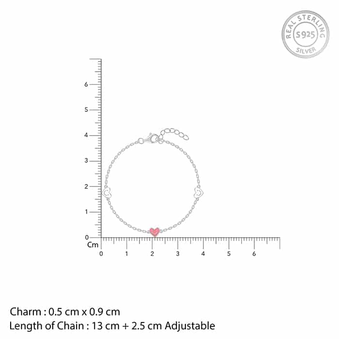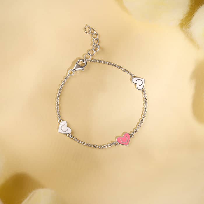 The Inspiration: Tiny hearts, big smiles. This bracelet turns every moment into a celebration of love. It’s a little spark of joy for the one who loves out loud and laughs even louder! The Design: This silver kids bracelet features triple smiley heart motifs with colourful enamel. 925 Silver Perfect for kids’ sensitive skin Motif Size: Height – 0.5 cm, Motif Width – 0.9 cm Length of Chain: 13 cm + 2.5 cm Adjustable Comes with the Nikrish Jewellery kit and authenticity certificate Content: Bracelet Net Qty- 1 unit Suitable for kids aged 2 – 8 Years Styling Tip: Pair this with a cute frock.