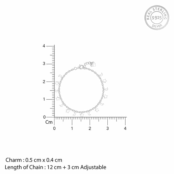 The Inspiration: A bracelet that brings the moon’s calm and a star’s sparkle. Perfect for every giggle, nap, and cuddle. The Design: This silver bracelet for kids features evenly spaced star and moon motifs all along the chain. 925 Silver Perfect for kids’ sensitive skin Charm: 0.5 cm x 0.4 cm Length of chain: 12 cm + 3 cm Adjustable Comes with the Nikrish Jewellery kit and authenticity certificate Content: Bracelet Net Qty- 1 unit Styling Tip: Pair this with a blue t-shirt and shorts.