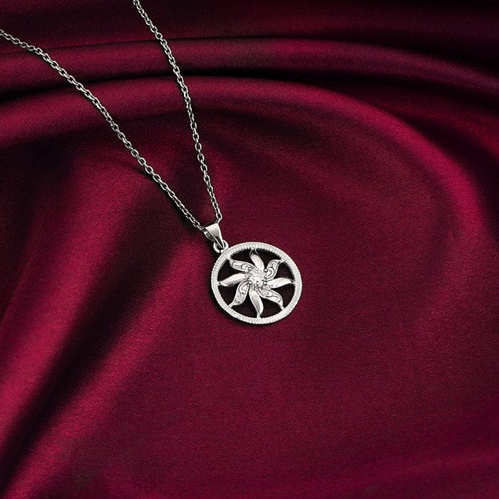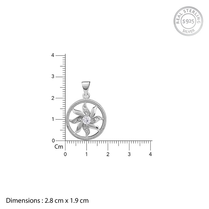 The Inspiration: A great style gives way for confidence to shine. This pendant will be your preferred choice for those days when you feel like dressing bold. The Design: This silver pendant features a circle motif with the sun flares in a floral design nestling a zircon. 925 Silver Perfect for sensitive skin Length of chain: 43 cm + 4 cm Adjustable Motif Height: 2.8 cm, Width: 1.9 cm Comes with the Nikrish Jewellery kit and authenticity certificate Content: Pendant With Link Chain Net Qty- 1 unit Styling Tip: Suit this pendant with a scoop neck top.