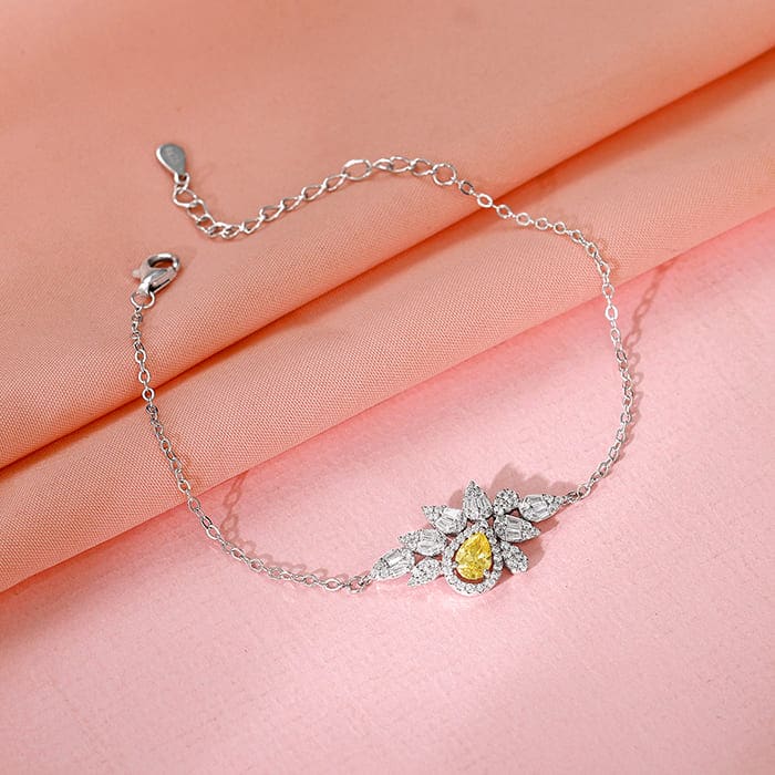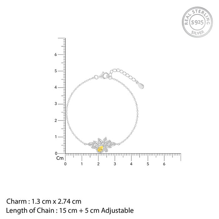 The Inspiration: Because your wrist deserves its own little garden party! The Design: This silver bracelet for women features a floral design set with zircons and a coloured stone teardrop motif placed at the centre. 925 Silver Perfect for sensitive skin Motif Size: Height – 1.3 cm, Width – 2.74 cm Length of Chain: 15 cm + 5 cm Adjustable Comes with the Nikrish Jewellery kit and authenticity certificate Content: Bracelet Net Qty- 1 unit Styling Tip: Team this with a monochrome yellow saree.