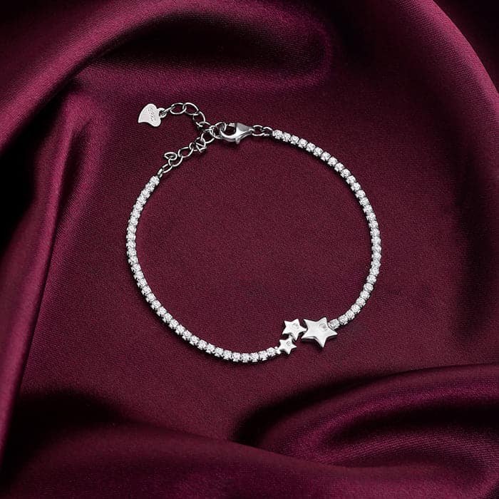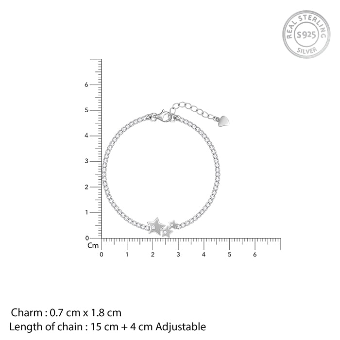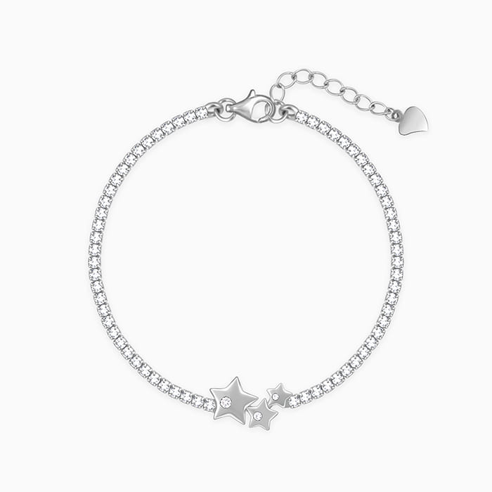 The Design: This silver tennis bracelet features triple star motif with zircons placed on top, and the chain is studded with zircons. 925 Silver Perfect for sensitive skin Motif Height: 0.7 cm, Width: 1.8 cm Length of chain: 15 cm + 4 cm Adjustable Comes with the Nikrish Jewellery kit and authenticity certificate Content: Bracelet Net Qty- 1 unit Styling Tip: Pair this with a denim jumpsuit.