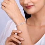 The Design: This silver tennis bracelet features triple star motif with zircons placed on top, and the chain is studded with zircons. 925 Silver Perfect for sensitive skin Motif Height: 0.7 cm, Width: 1.8 cm Length of chain: 15 cm + 4 cm Adjustable Comes with the Nikrish Jewellery kit and authenticity certificate Content: Bracelet Net Qty- 1 unit Styling Tip: Pair this with a denim jumpsuit.