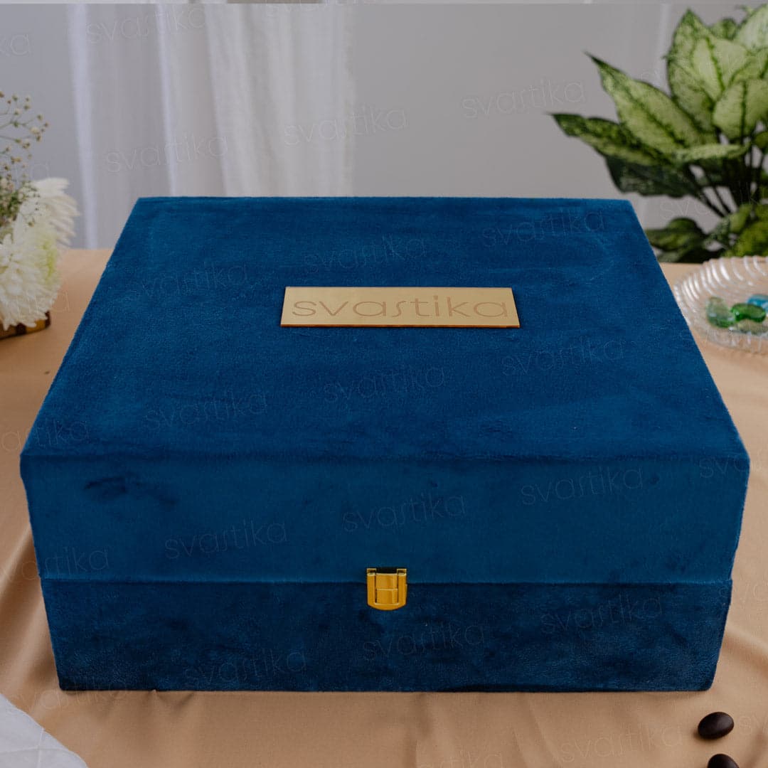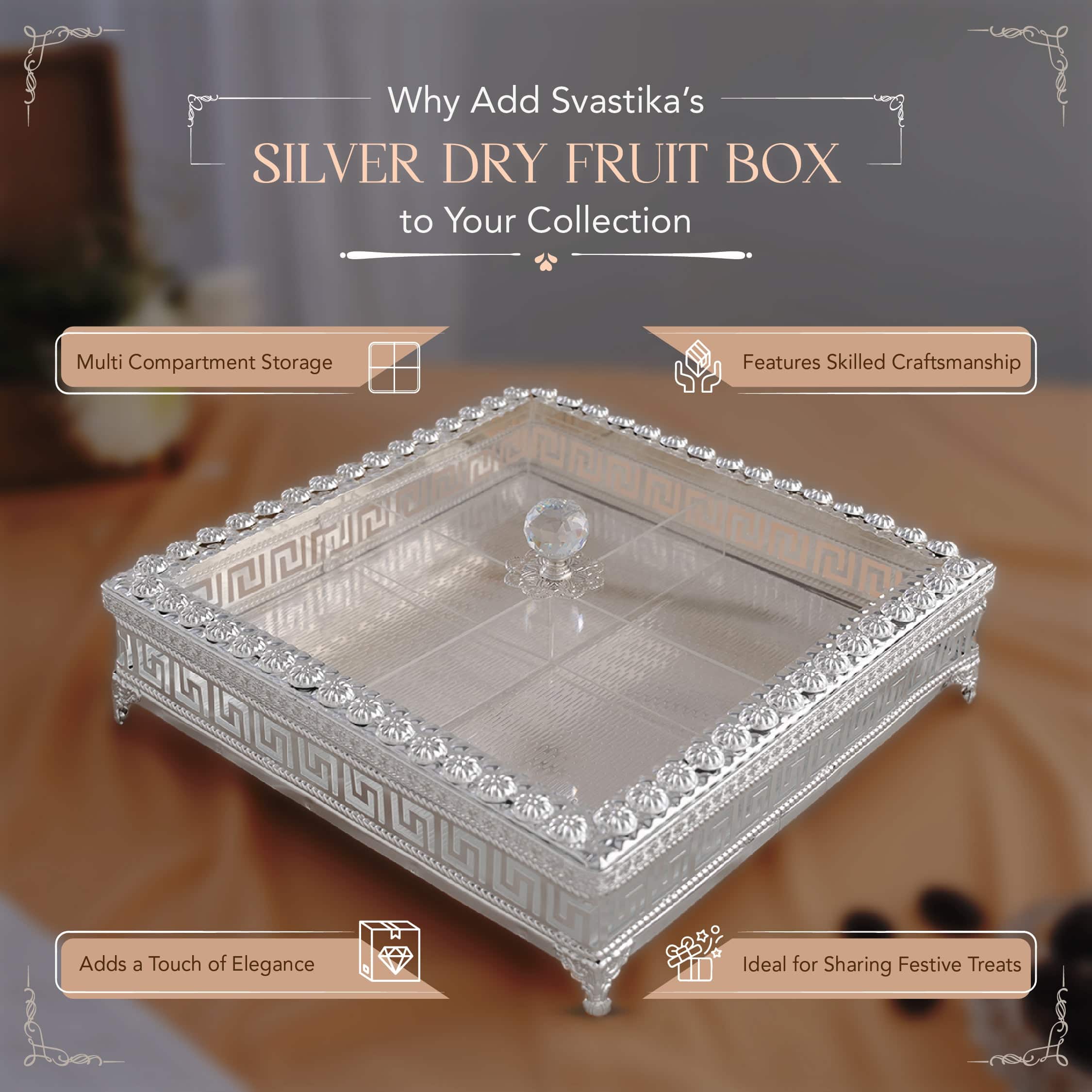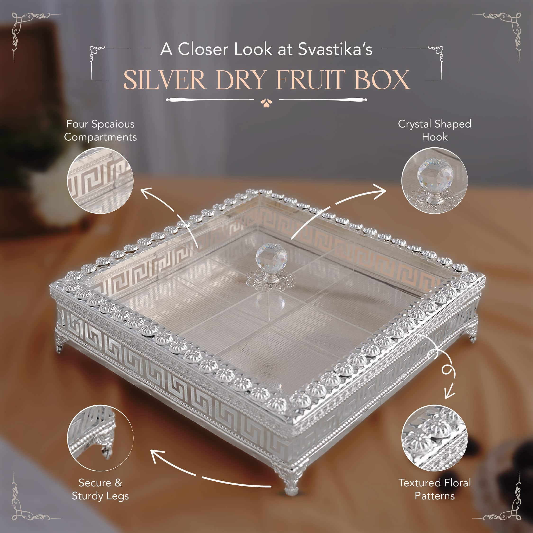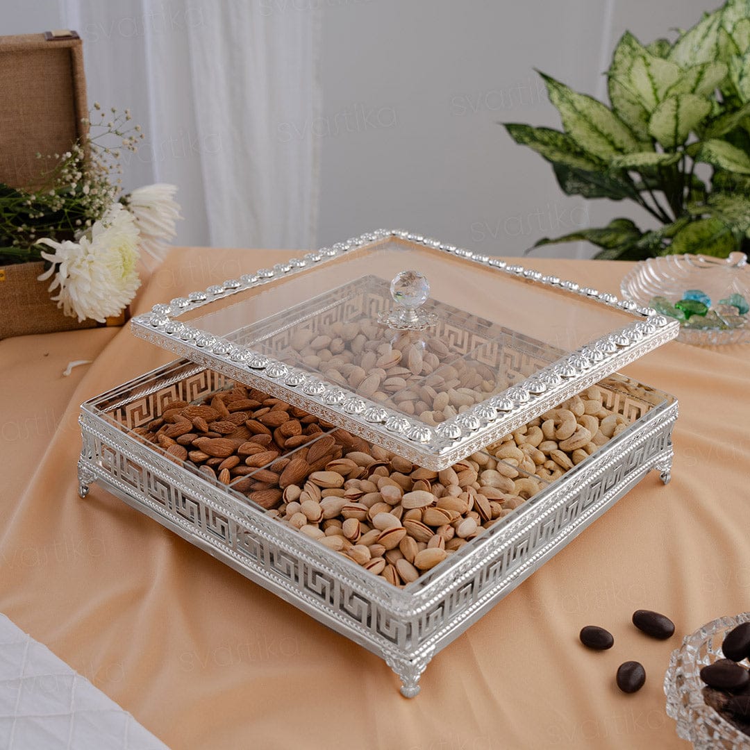 Elevate your festive gatherings with our Square Decorative Dry Fruit Box , designed to combine luxury and functionality most elegantly. Crafted from premium German silver, this Square dry fruit storage box is not only a practical solution for serving treats but also a stunning centerpiece for any occasion. With a generous 12-inch length/width and 3-inch height, this Square dry fruit box offers ample storage in its four spacious compartments. The box’s square shape, combined with its secure, sturdy legs, ensures both stability and style. The crystal-shaped hook on its transparent lid adds a modern touch, while the traditional floral patterns and realistic texture on all sides create a timeless, luxurious look. This Square German silver dry fruit box is a true work of art. The textured floral patterns and meticulously crafted details make it perfect for showcasing your finest festive treats. The four compartments allow for easy organization, making it ideal for sharing a variety of dry fruits and nuts. Whether for your festive celebrations or as a thoughtful gift, this decorative dry fruit box is the perfect choice. Packaged in a premium blue velvet box for added protection and a luxurious presentation, this square dry fruit box is also an excellent gifting option for weddings, housewarmings, or any special occasion. Add a touch of elegance to your celebrations today!