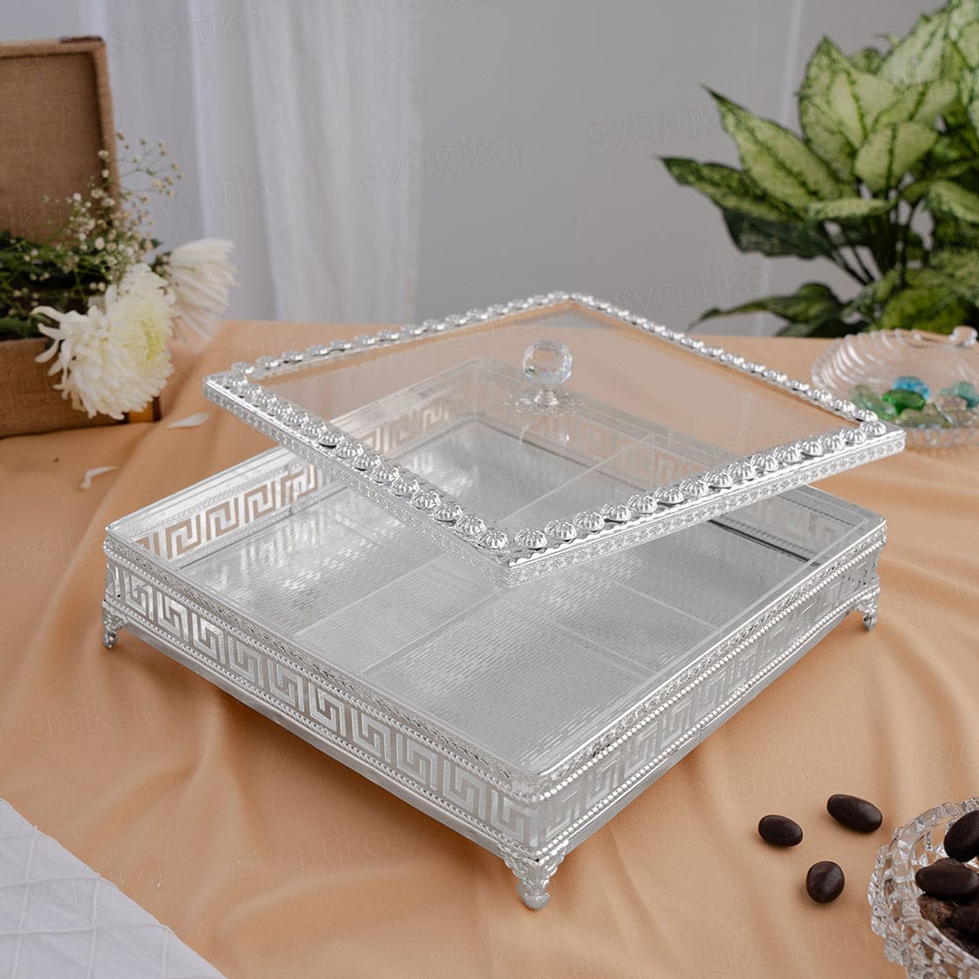 Sqaure Dry Fruit Box With Transparent Lid – German Silver (12 Inch)