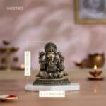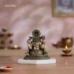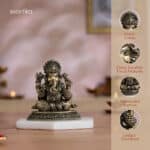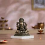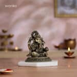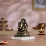 Experience the timeless grace of Vighnaharta with our 4″ small brass Ganesha idol. This finely crafted Lord Ganesha murti, perfect as a Ganesh idol for a pooja room or office desk, depicts the beloved deity in regal splendor. This Ganesh Statue, adorned with intricate details, serves as both a symbolic centerpiece and an elegant home decor item. As a Ganapathi statue or Vinayaka statue for home, it’s an ideal Ganesh Idol for Gift, suitable for housewarming return gifts, corporate gift hampers, or wedding return gifts and festive occasions like Diwali, Navratri, and Dussehra. The small Ganesha murti, with its four symbolic arms and loyal Mushakraj, is perfect for Ganpati idols for Ganesh Chaturthi or year-round display. Its compact size makes it versatile for various settings. Bring home this sitting Ganesha brass idol as a symbol of wisdom and positive energy. Whether for your home mandir or as a thoughtful gift, this Ganapati murti symbolizes positivity and success in all endeavors. Note: This brass product is hollow from the inside. Note: The stand shown in the image is for photography purposes only and is not included with the idol.