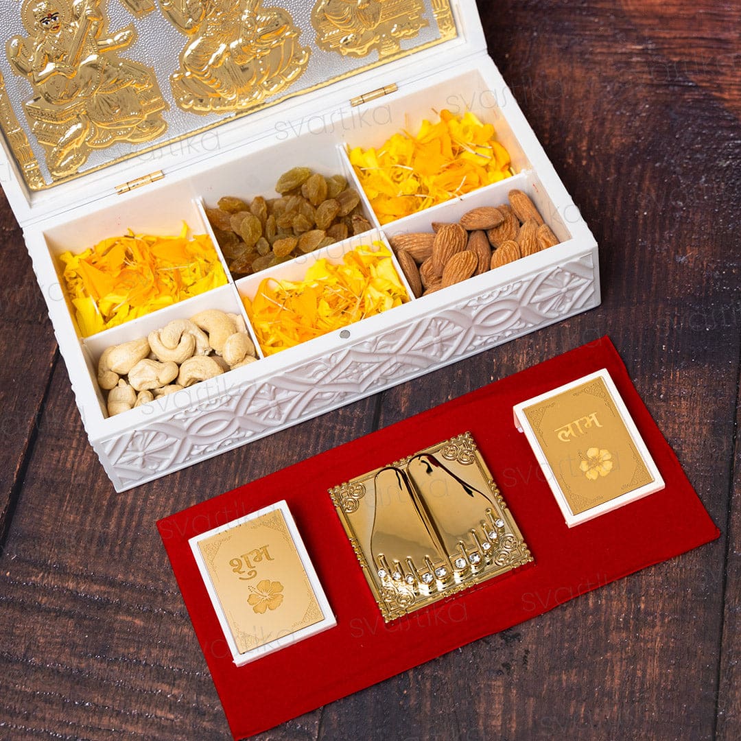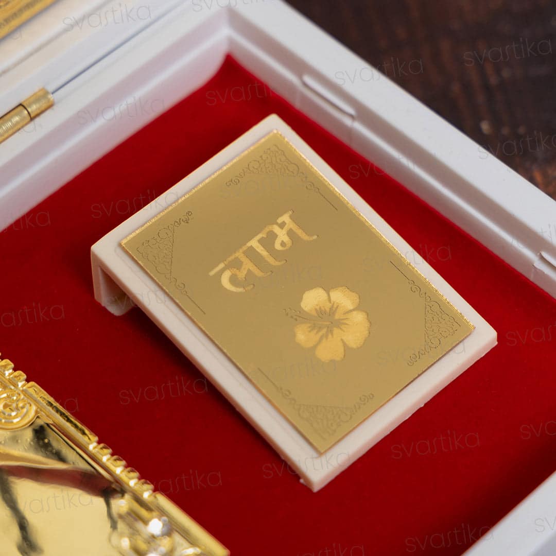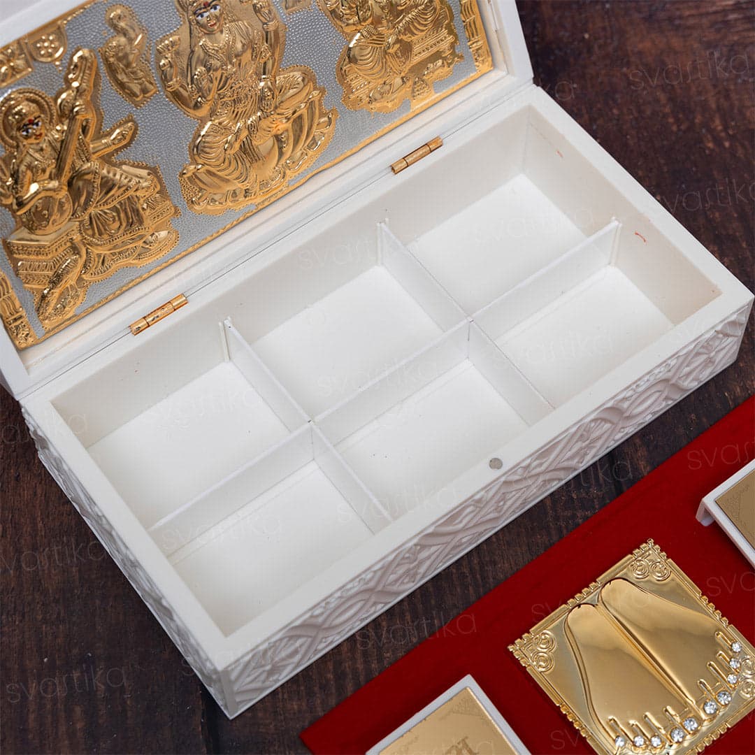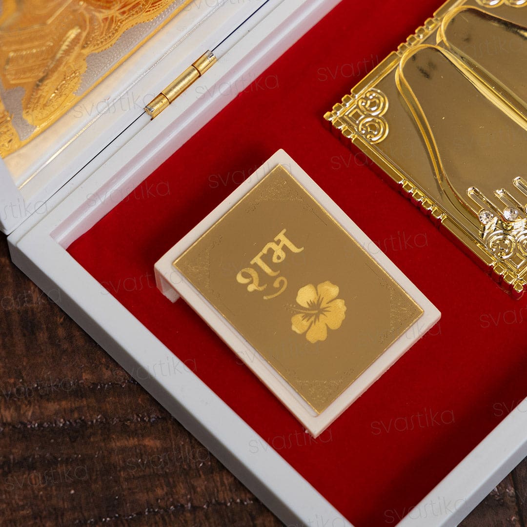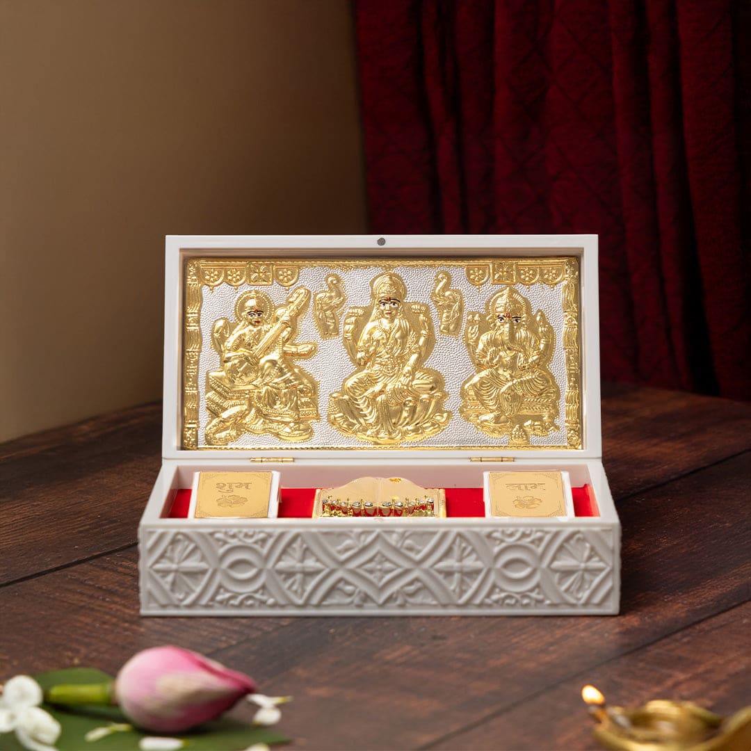 laxmi ganesh saraswati This beautifully designed Lakshmi Ganesh Saraswati Pocket Temple is more than a compact shrine, It features the holy trio in luxurious Gold plating and also includes a sacred charan paduka, highlighting a perfect blend of spiritual meaning and artisanal elegance. Why do travelers around the world prefer Svastika’s Pocket Temple? Brings the triple blessings of wisdom, wealth, and learning into one sacred space Ultralight and portable, It is ideal for pooja rooms or as an elegant laxmi ganesh saraswati photo frame substitute Thoughtfully sized to blend with modern decor while holding spiritual relevance Ready to gift, with premium packaging that reflects reverence and care It allows travellers to keep their deities close and maintain daily devotion wherever they go. Why Choose Svastika’s Laxmi Ganesh Saraswati Pocket Temple Over Others? Most pocket temples are bulky, lack fine detailing, and come without any gold finish. Svastika’s Laxmi Ganesh Saraswati Pocket temple is lightweight, intricately crafted, and gold-plated for a rich, divine feel. It’s not just portable, it’s thoughtfully made to carry grace wherever you go. How to Style This Pocket Temple with Thoughtful Add-Ons? Elevate your pooja setup by placing the Lakshmi Ganesh Saraswati pocket temple on a Pearl Chowki for a graceful base. Add a warm glow with a Brass Diya , and complete the setting with Lakshmi Charan Paduka to invite divine energy and blessings into your home. We Offer Special Discounts on Corporate & Bulk Orders Customization/Branding – Want to personalise our Pocket temple? We can print your brand name/event on the outer box. It can be used by corporates, small business owners, for events like weddings, house warming etc.