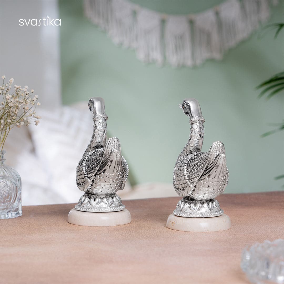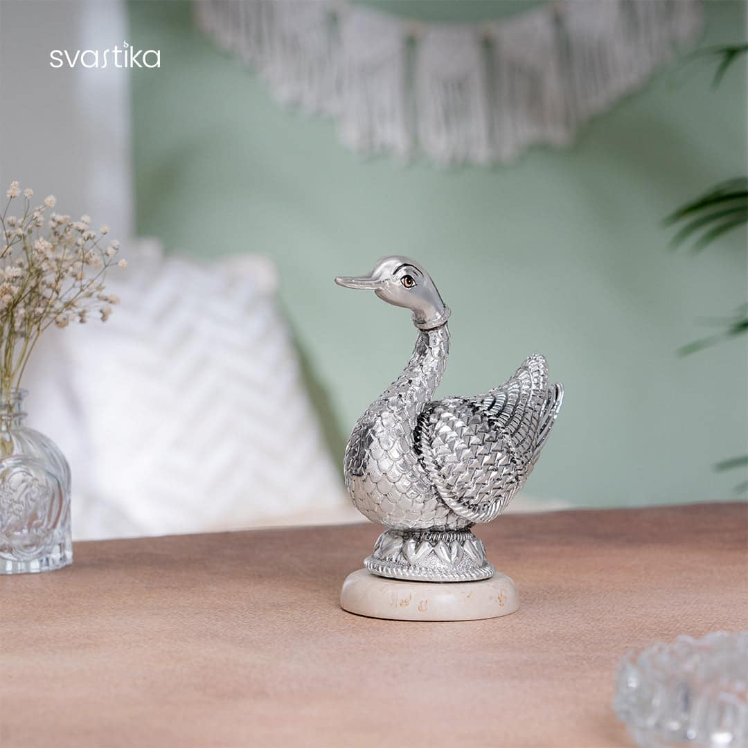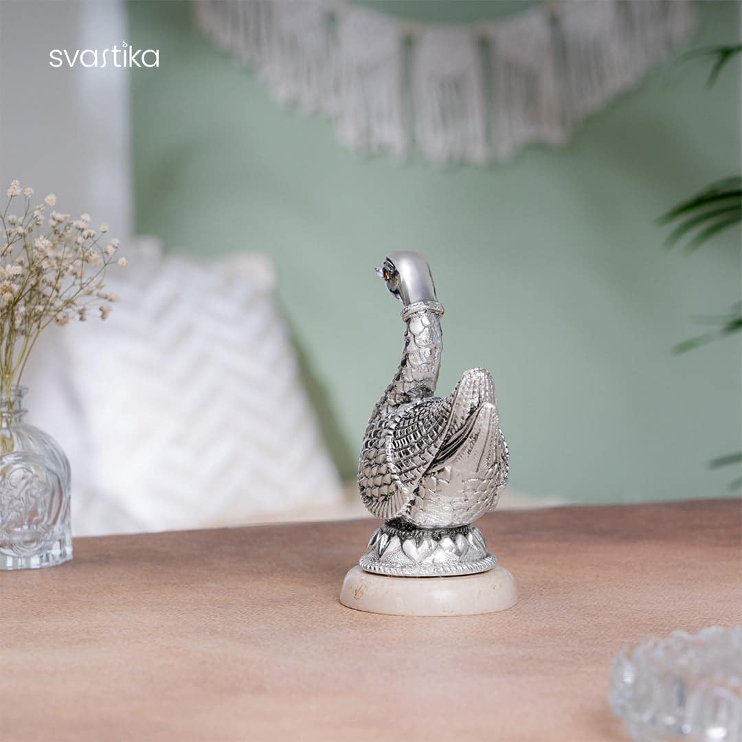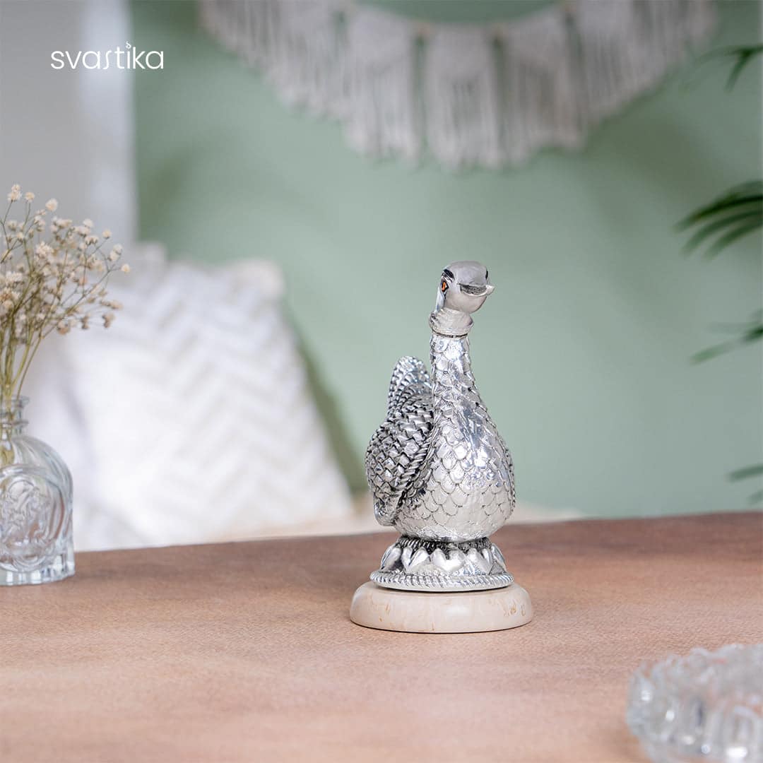 Add a touch of elegance and divinity to your home with this beautifully crafted Silver Plated Swan Idol. This decor item sits gracefully on a sturdy round base, making it a stunning addition to your living space, mandir, or pooja room. The swan, known for its grace and purity, is intricately designed with detailed feathers and a refined silver finish that exudes sophistication. Whether placed on a tabletop or gifted during festive occasions, this silver swan idol radiates calmness and charm. Its timeless appeal makes it a perfect keepsake for spiritual enthusiasts and those who want tasteful decor.