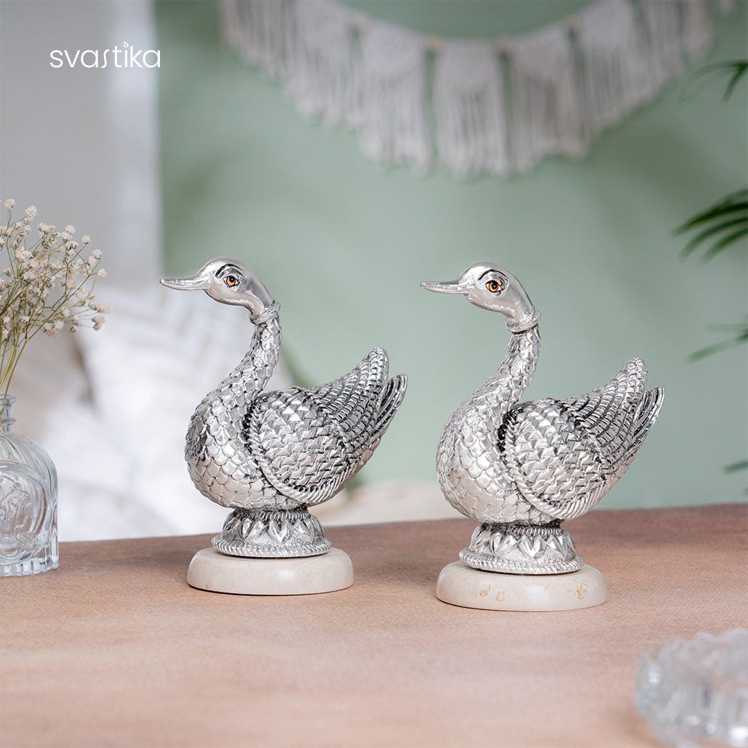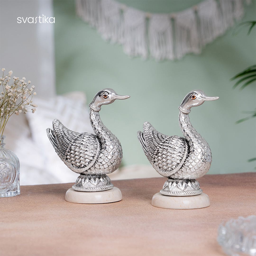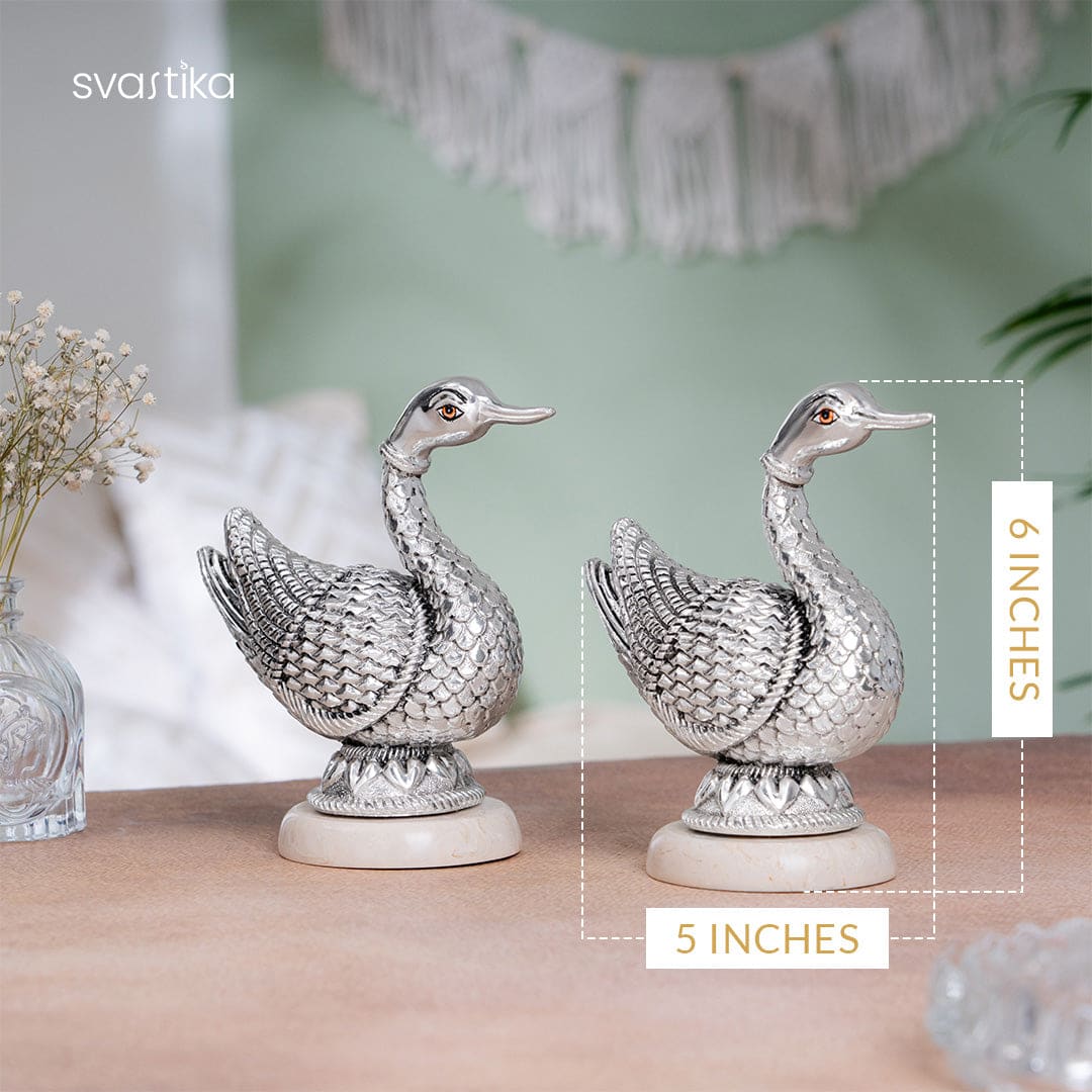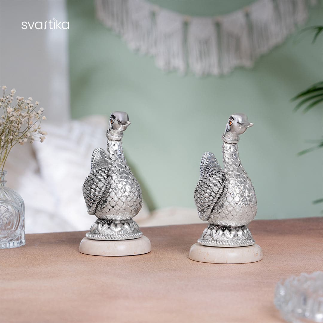 Add a touch of elegance and divinity to your home with this beautifully crafted Silver Plated Swan Idol. This decor item sits gracefully on a sturdy round base, making it a stunning addition to your living space, mandir, or pooja room. The swan, known for its grace and purity, is intricately designed with detailed feathers and a refined silver finish that exudes sophistication. Whether placed on a tabletop or gifted during festive occasions, this silver swan idol radiates calmness and charm. Its timeless appeal makes it a perfect keepsake for spiritual enthusiasts and those who want tasteful decor.